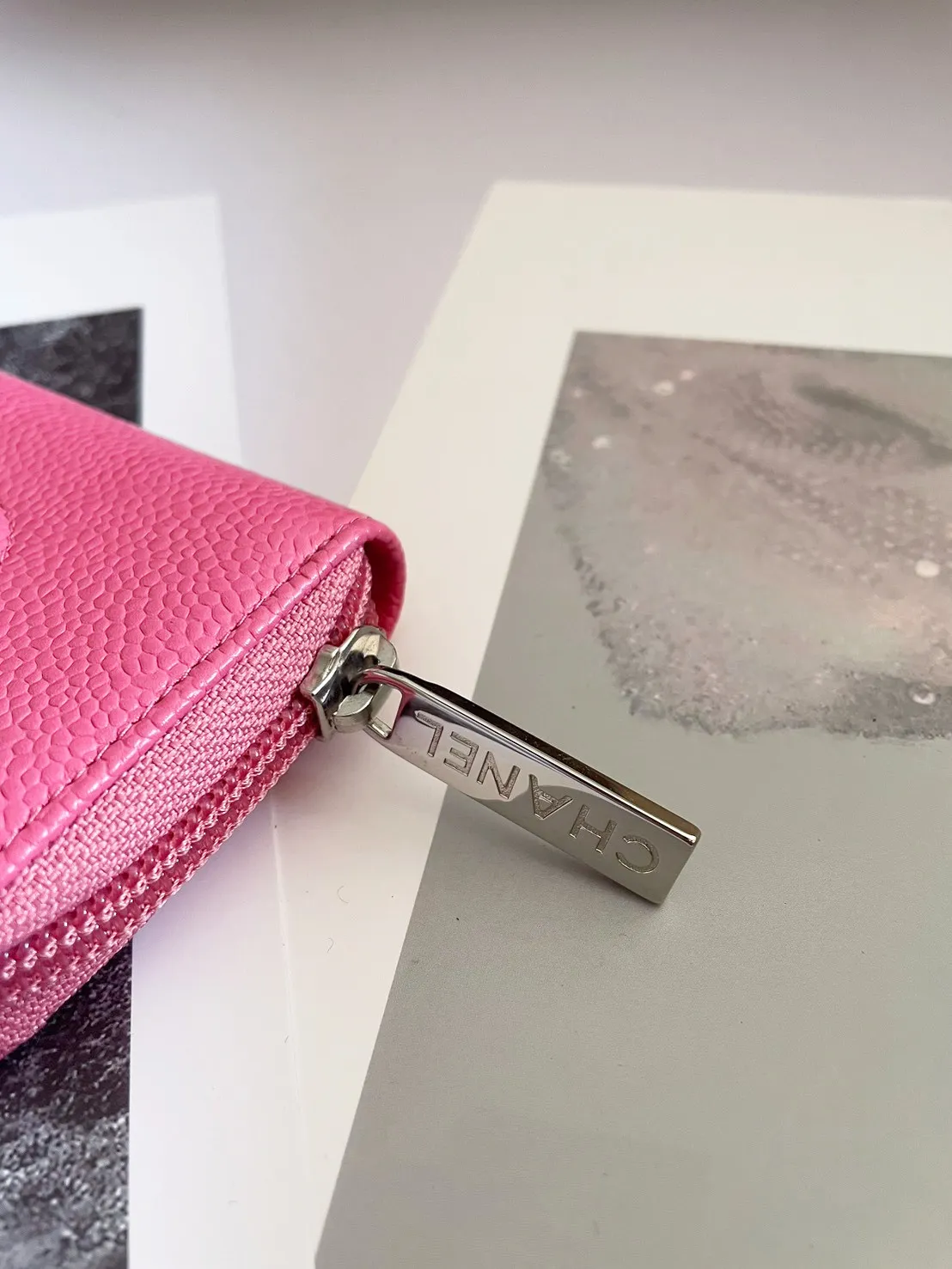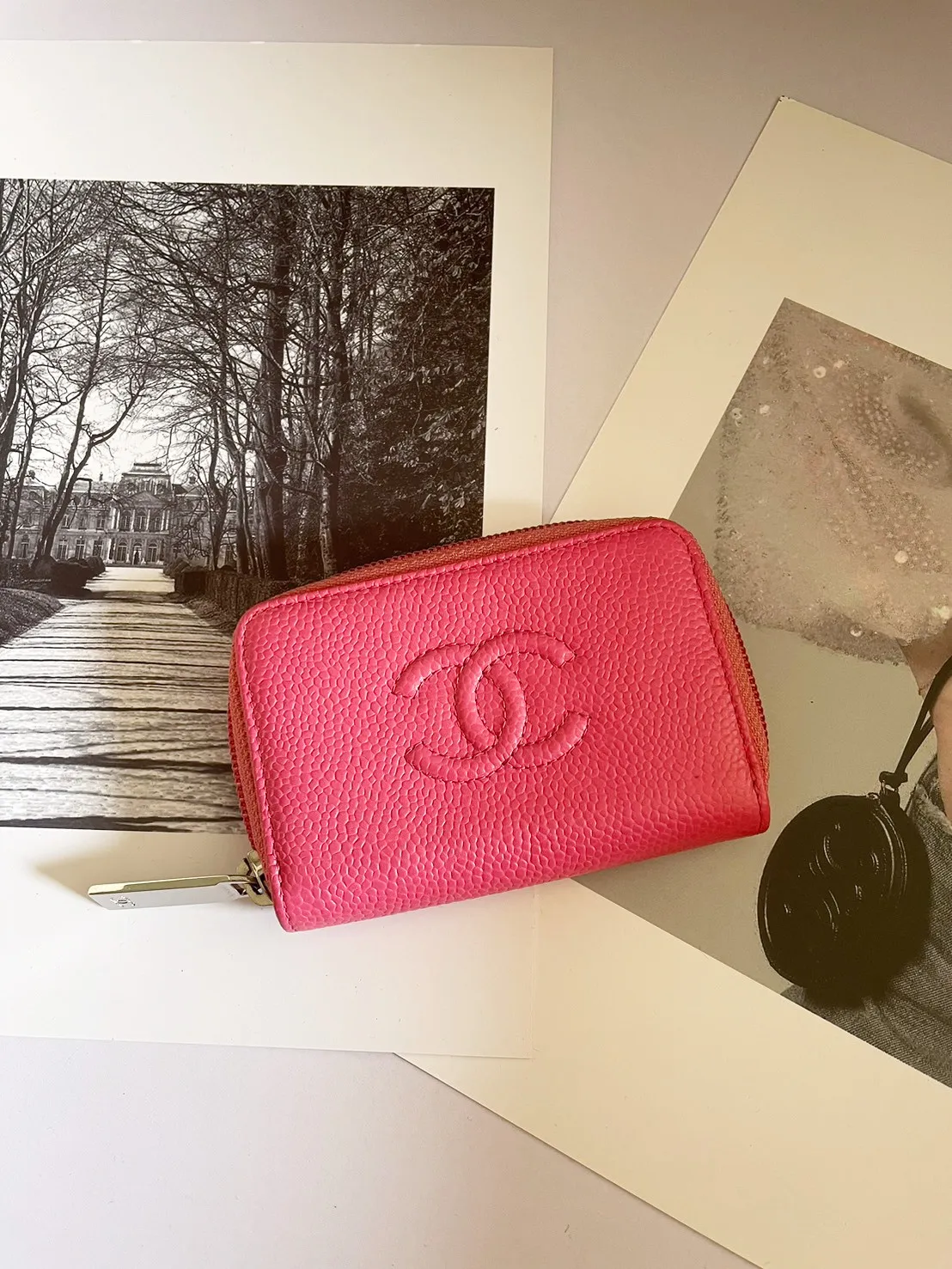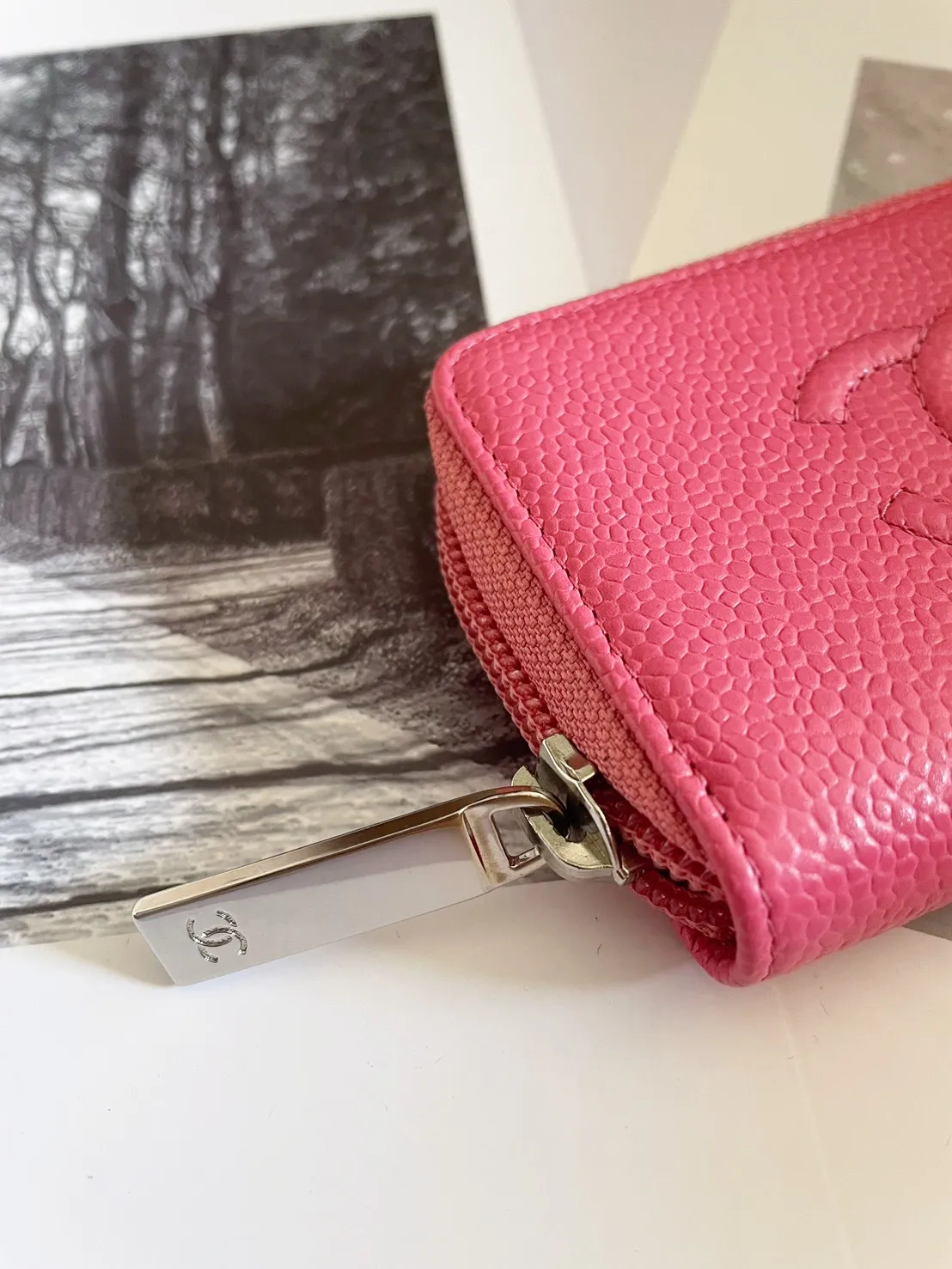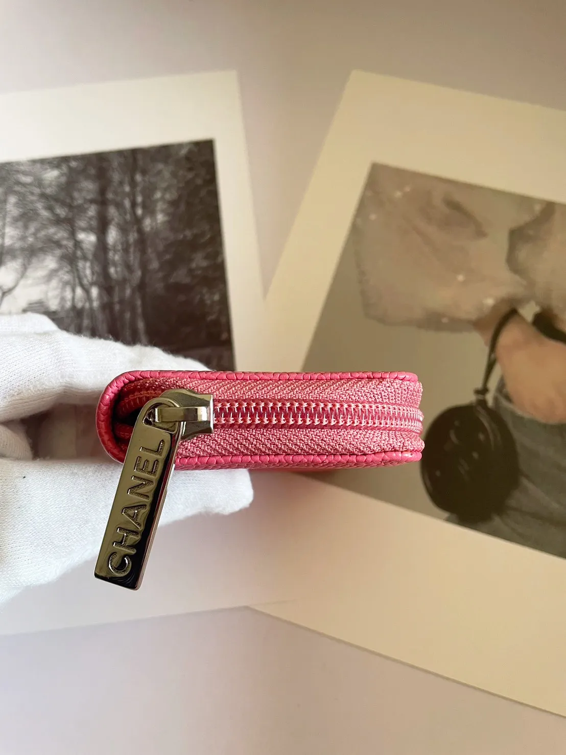 12標 Chanel 桃粉色荔枝皮銀扣拉鏈零錢包 22開 95成新