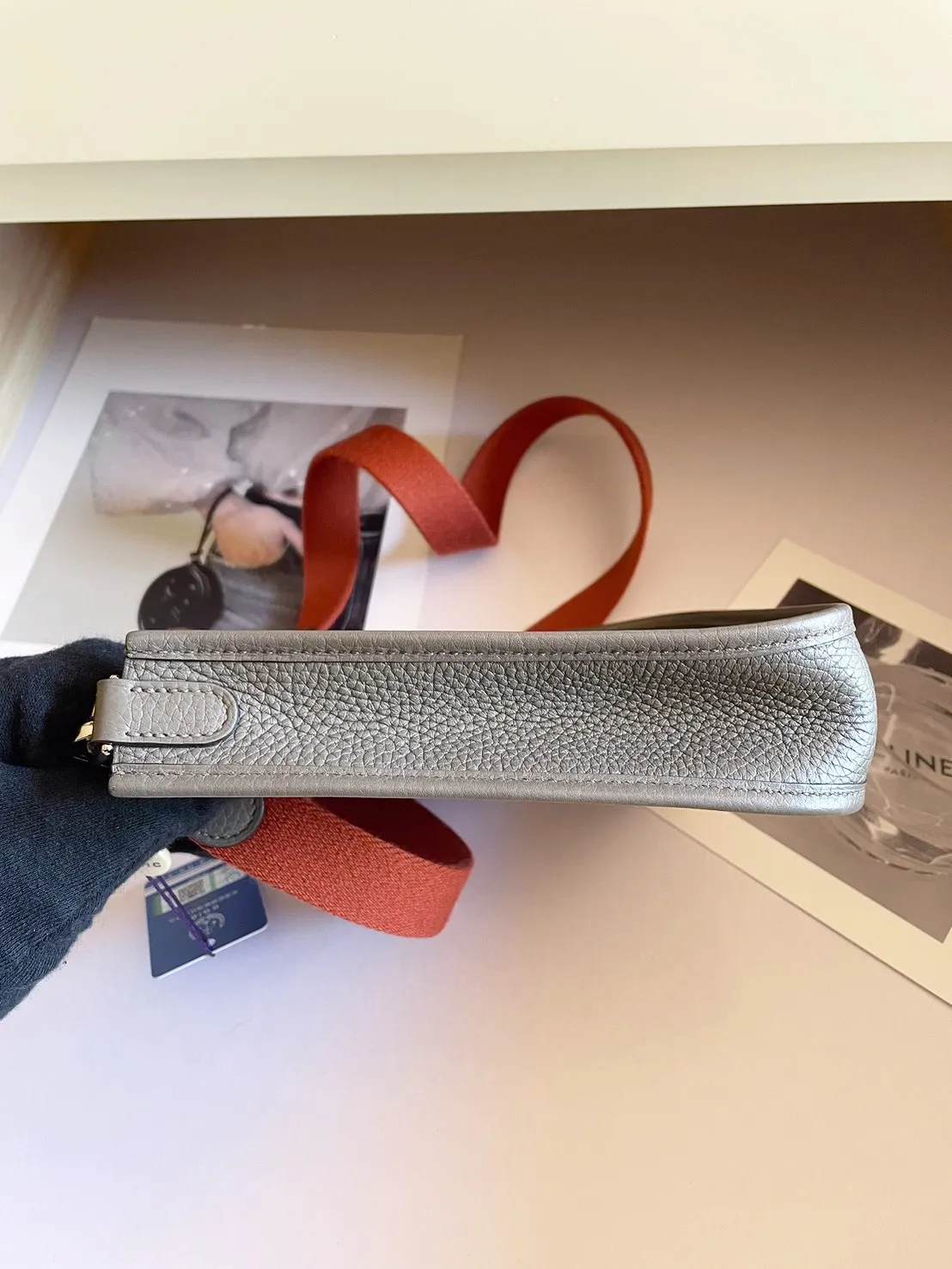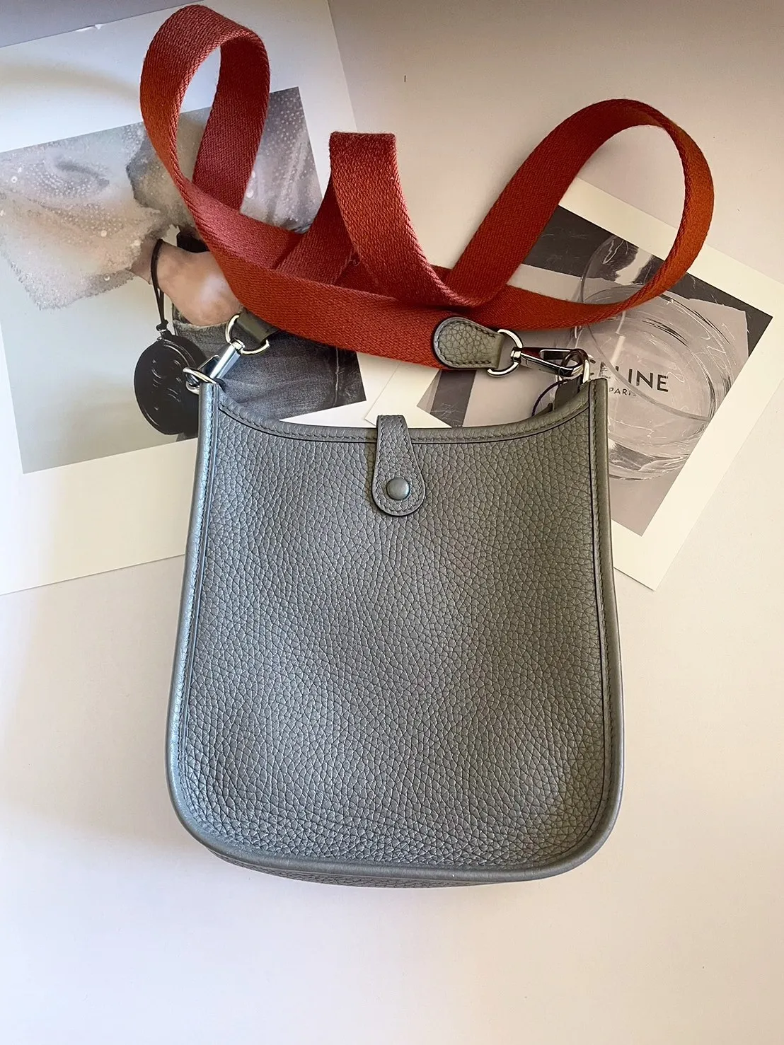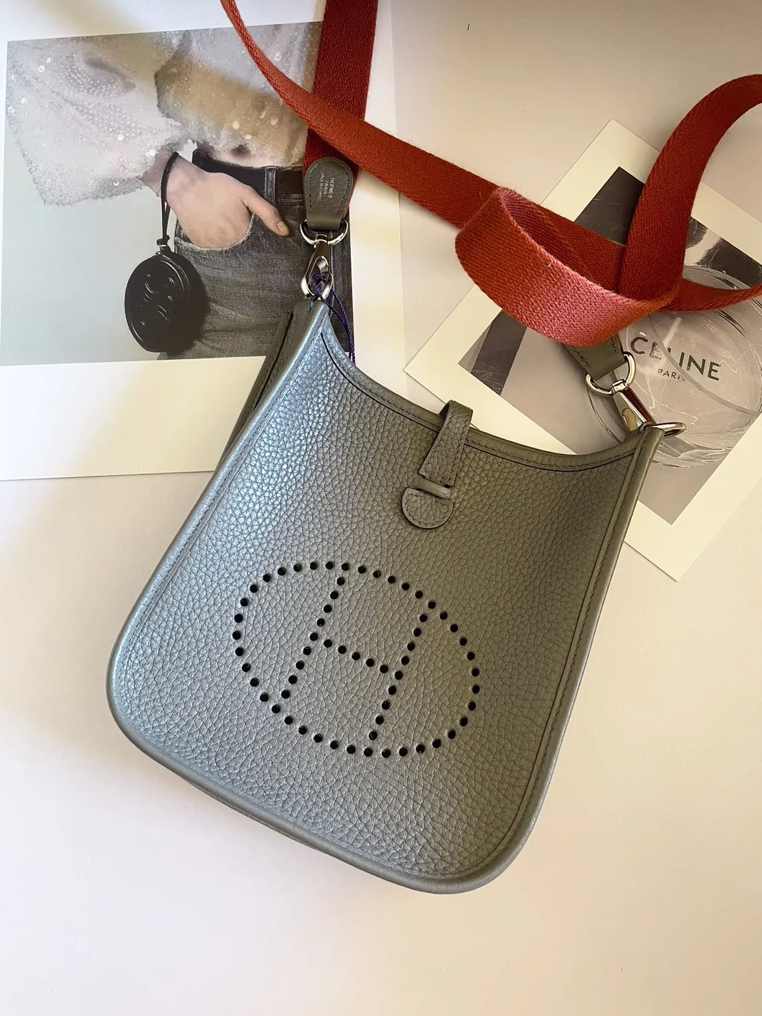34標 Hermes mini evelyne錫器灰 橘肩背帶 X刻 有盒 95成新