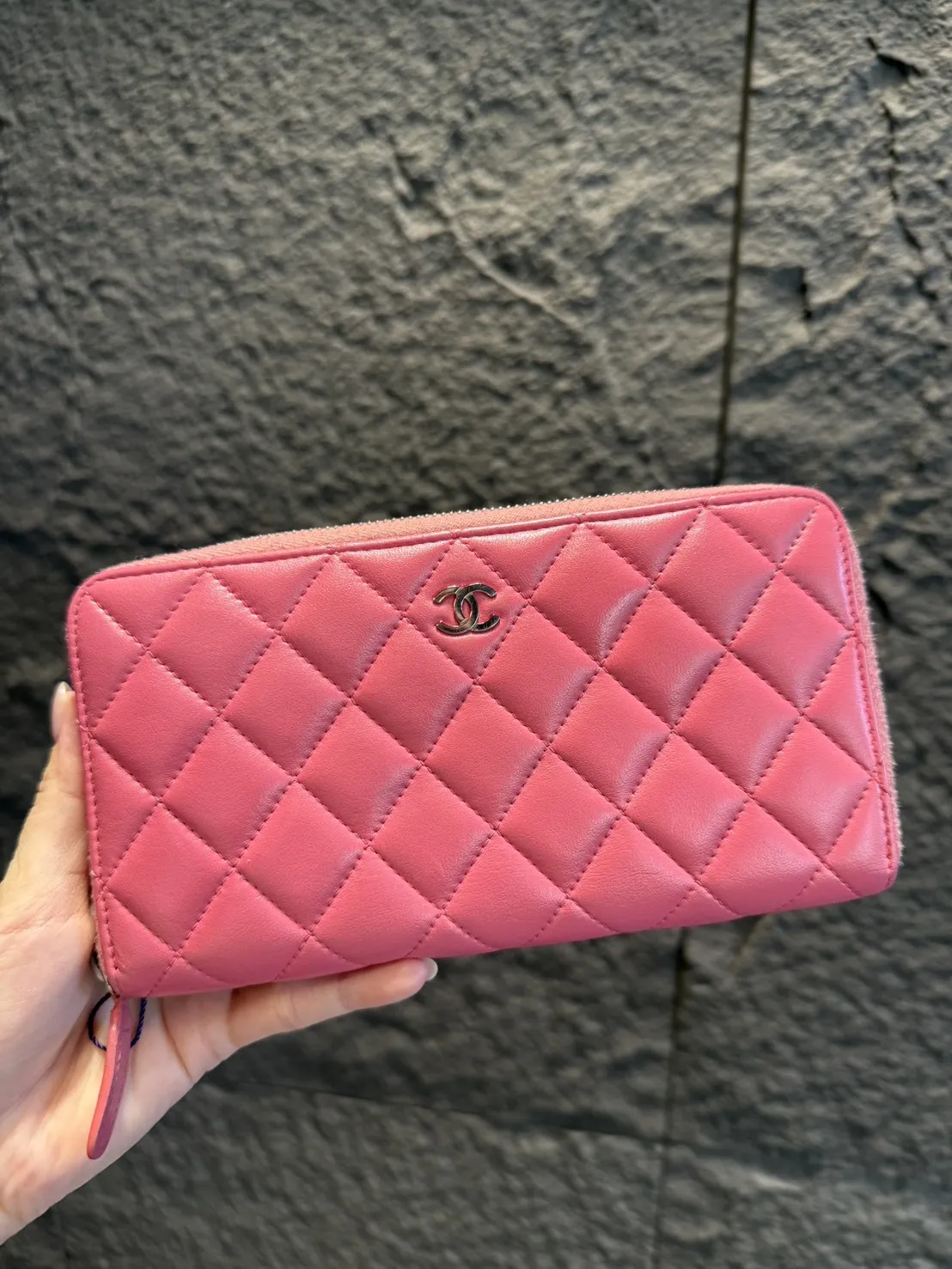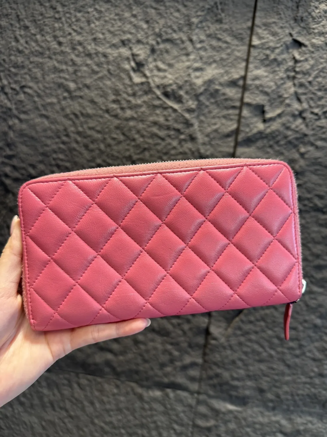 C03 Chanel 桃粉銀釦羊皮長夾 保卡16開 9成新