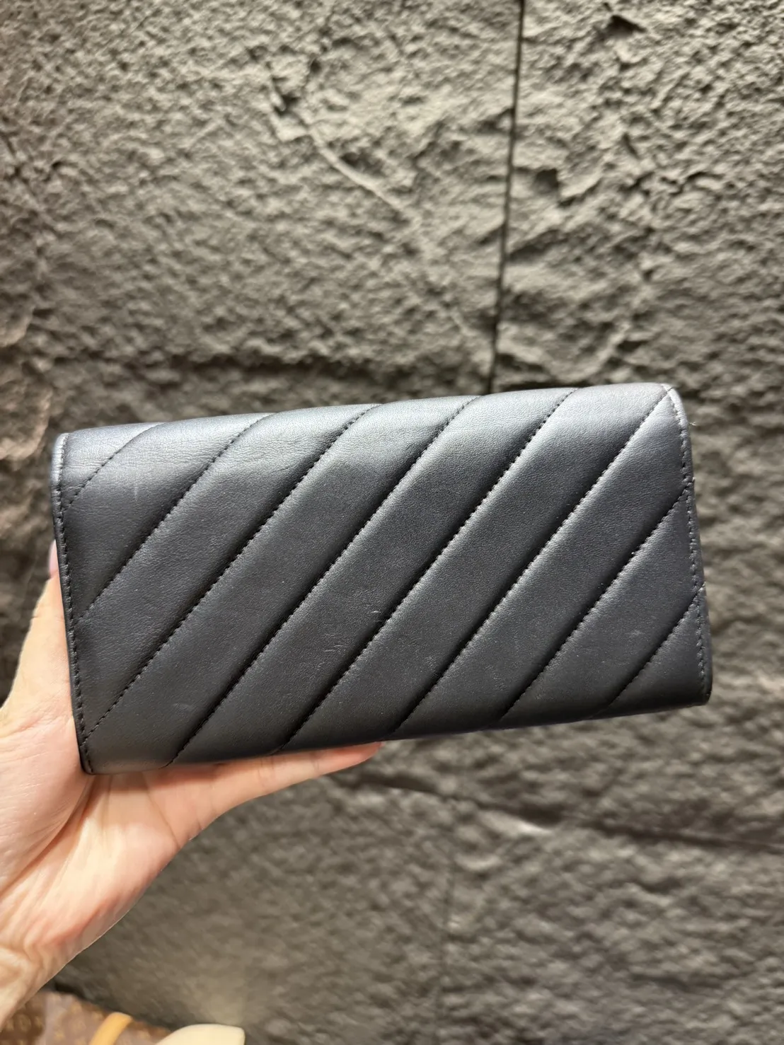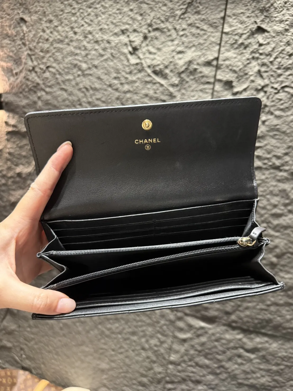 C27 Chanel 斜式山型紋黑釦信封長夾 羊皮 21開 95成新